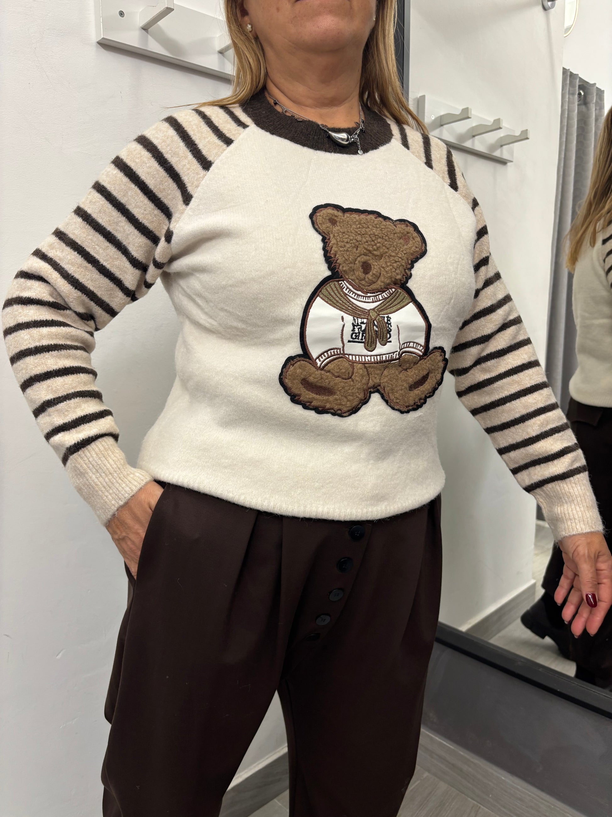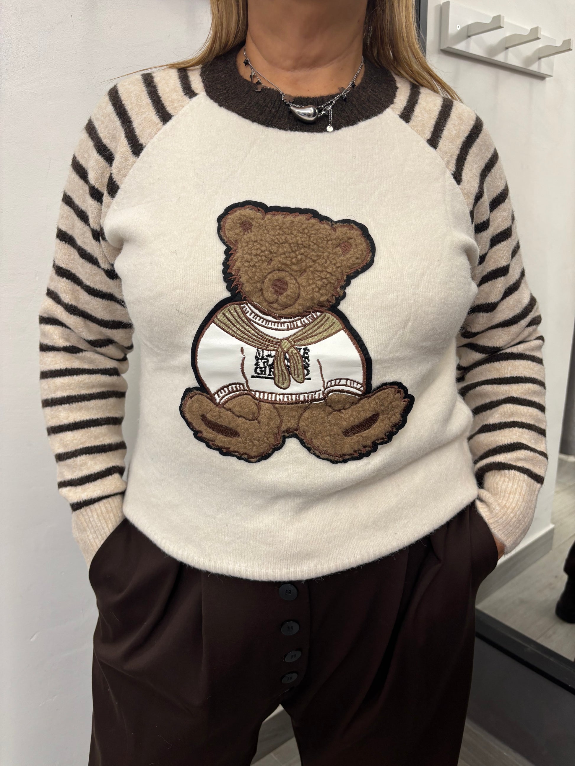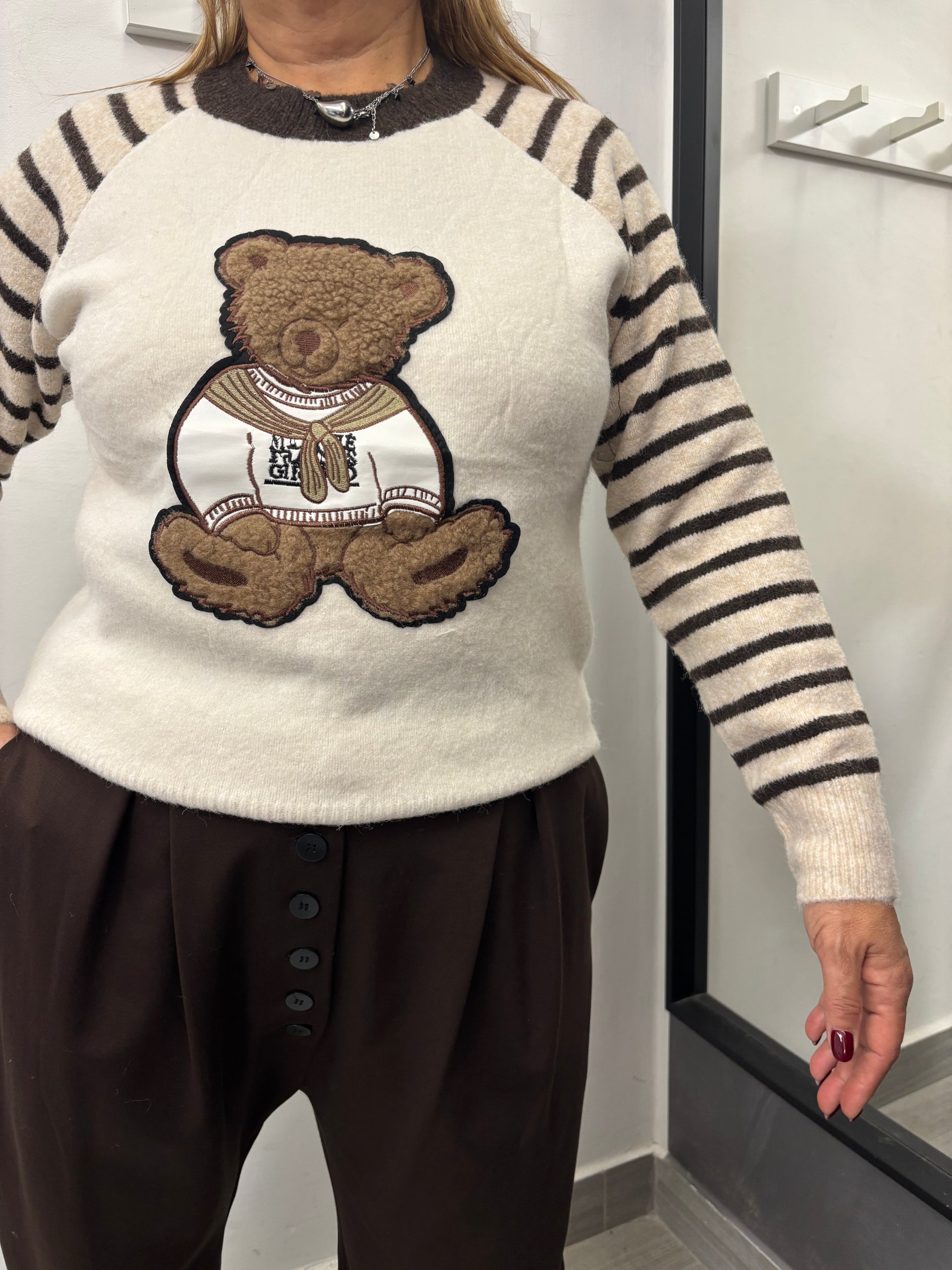 Maglione modello oversize, girocollo bordato del colore marrone, maniche a righe orizzontali nel colore beige e marrone. Davanti ha apllicato un orsetto. Taglia unica veste fino ad una 46. Composizione 65% viscosa 35% poliammide