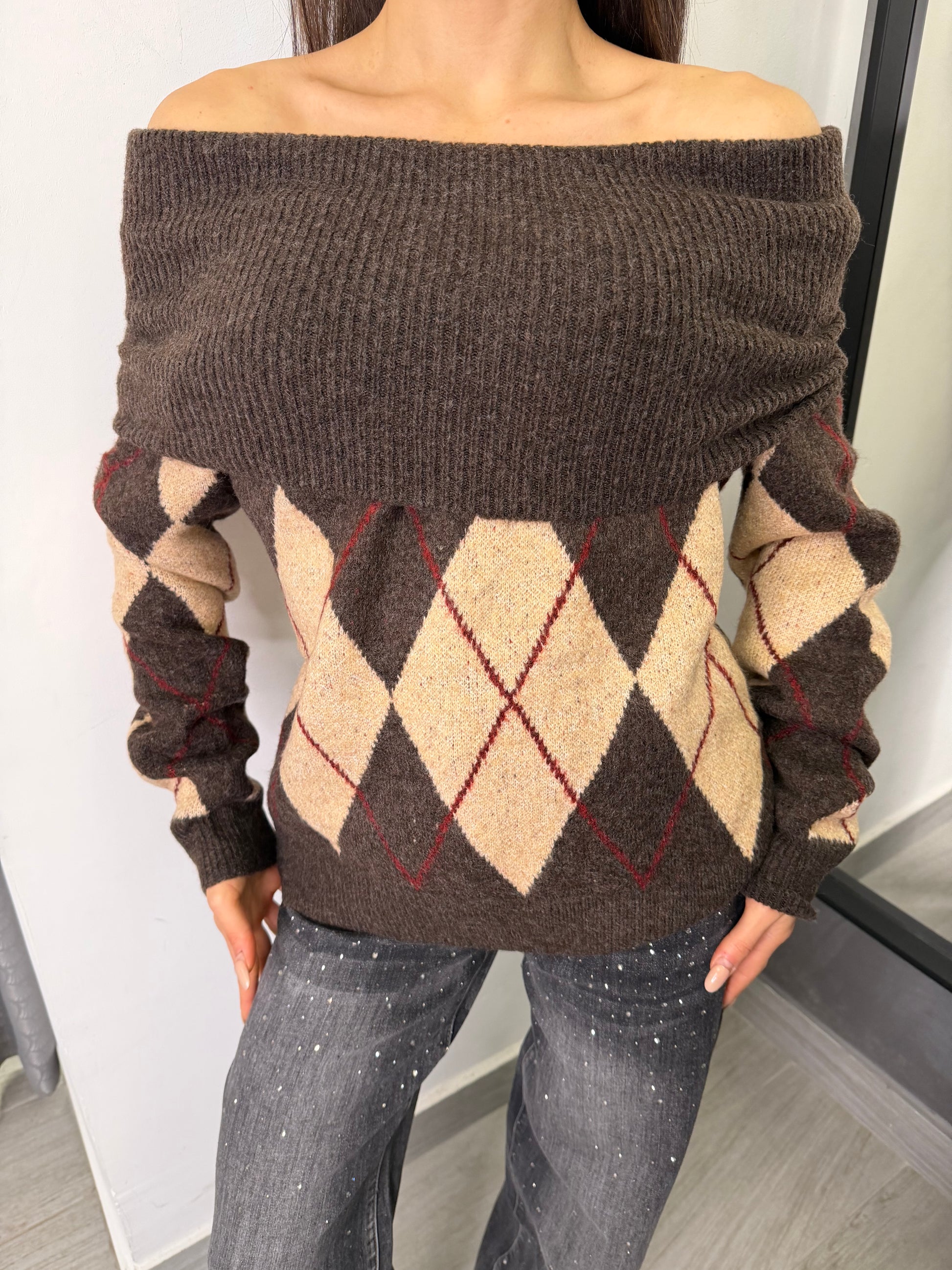 Maglione a rombi modello oversize con collo alto ad anello. Taglia unica veste fino ad una 48. Composizione 50% poliestere 45% poliammide 5% spandex