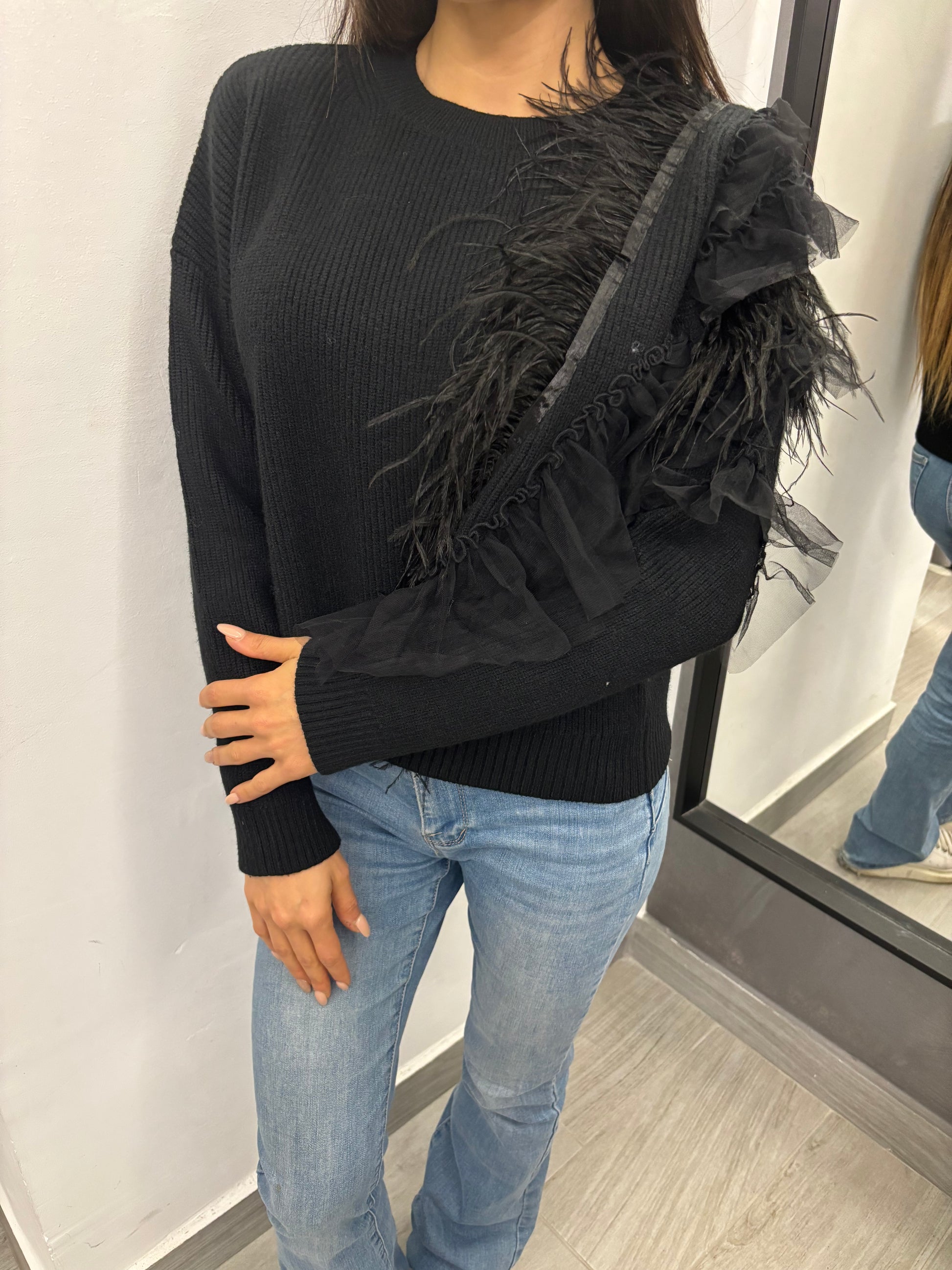 Maglione con tulle e piume sulla parte sinistra . Taglia unica veste fino ad una 46. Composizione 41% nylon 31% viscosa 28% poliestere