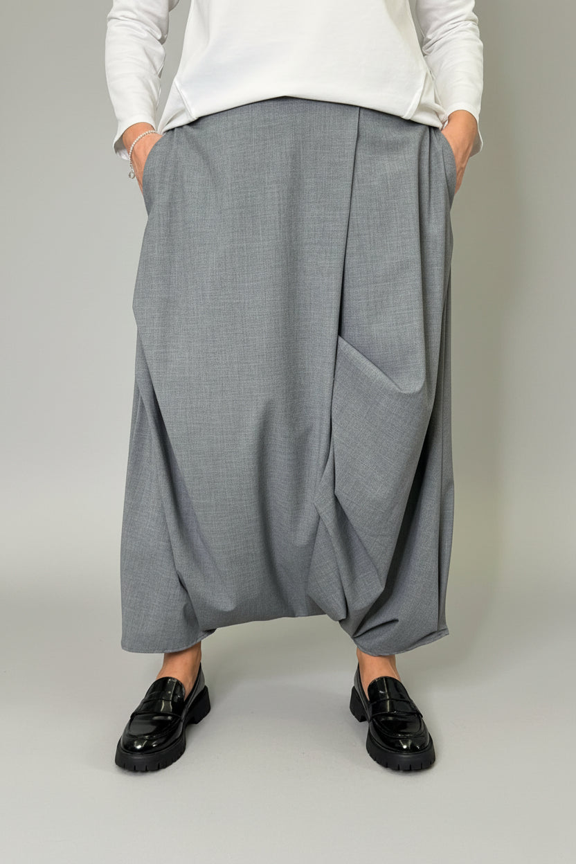 Pantagonna caratterizzato da un cavallo basso morbido e pieghe frontali. Il tessuto resta fluido, cade dritto e non segna. Vestibilità ampia, taglia unica veste fino ad una 46. Composizione 63% poliestere 35% viscosa 2% elastan. Circonferenza vita cm 78 massima estensione cm 90 circonferenza bacino cm 138