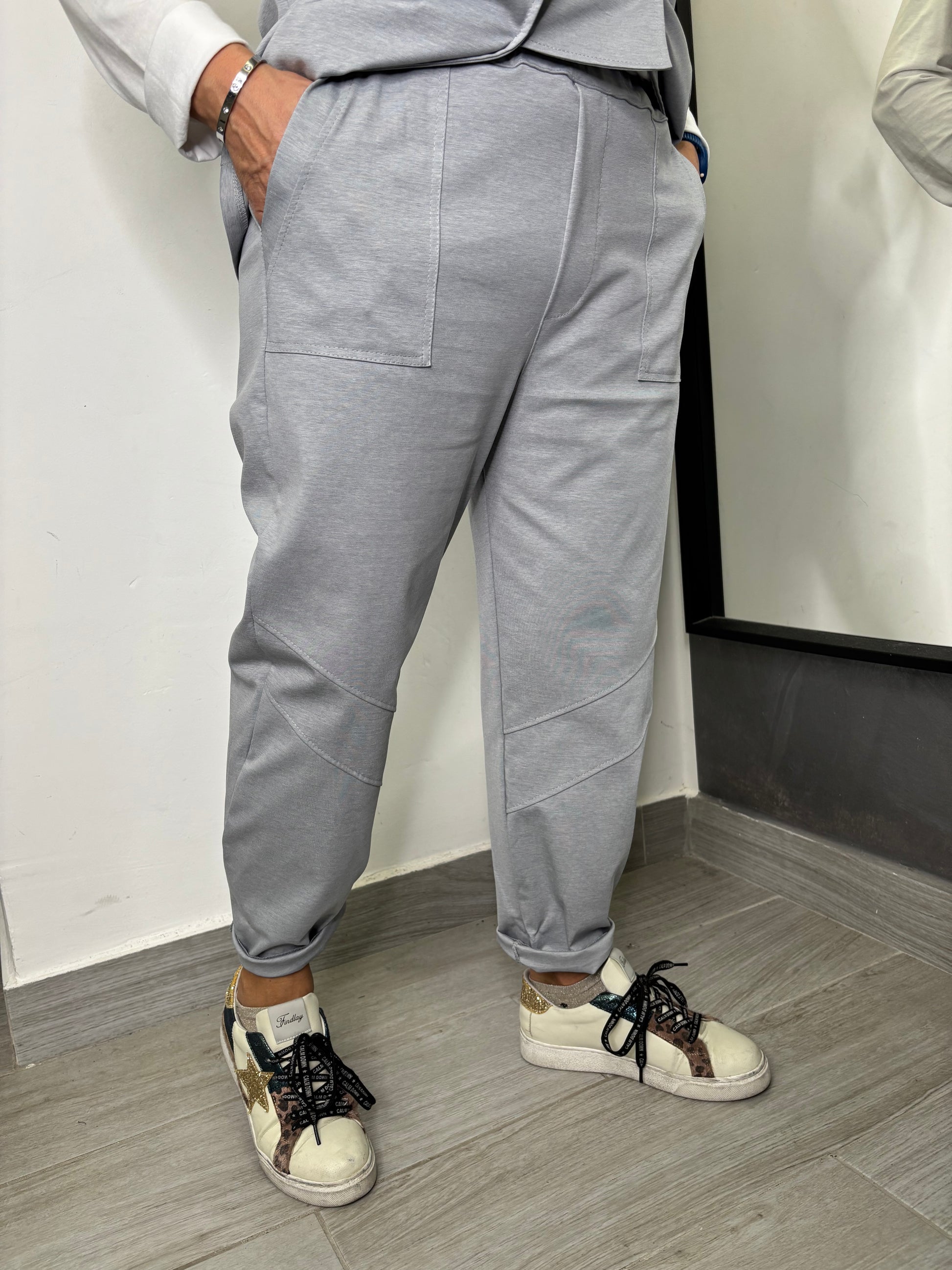Pantalone in tessuto punto Milano misto cotone, con elastico su tutta la circonferenza vita. Modello gamba larga, tasche davanti con impugnature e tasche applicate dietro. Cuciture con impuntature sulla parte finale della gamba. Taglia unica, veste fino ad una 46.