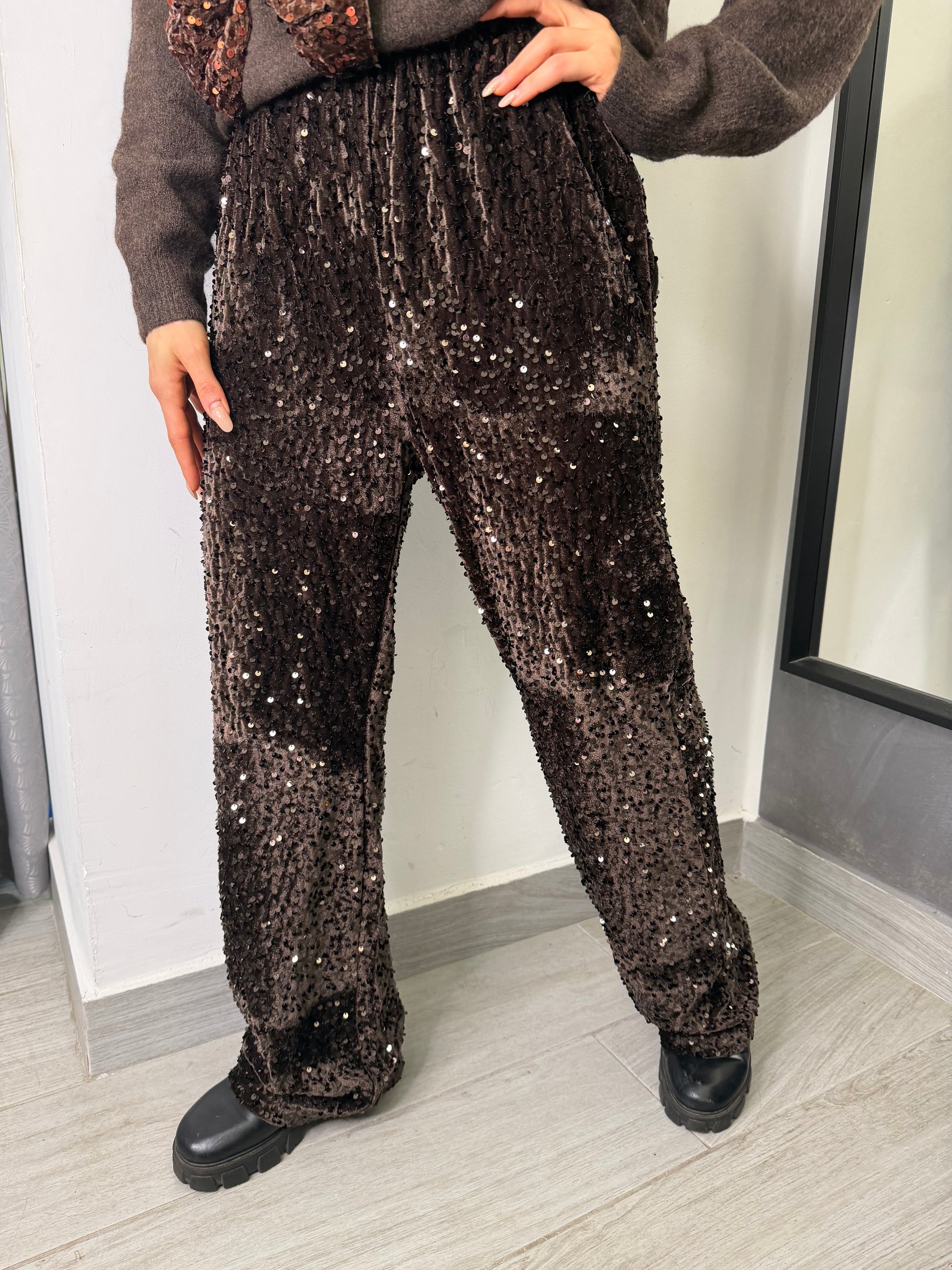 Pantalone con elastico in vita base velluto con applicazioni di paillettes dello stesso colore, gamba larga e tasche inserti nei fianchi. Taglia unica veste fino ad una 44.