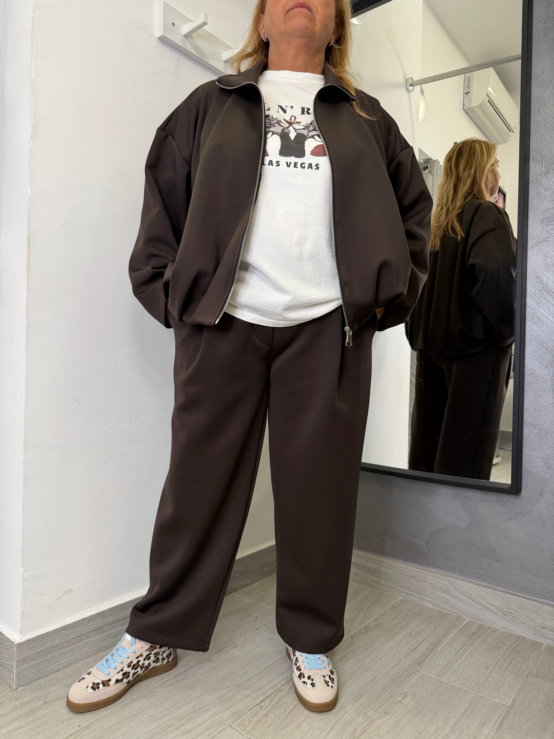 Pantalone gamba larga, modello a palloncino con elastico su tutta la circonferenza della vita, tasche trasversali. Taglia unica veste fino ad una 46. Composizione 89% poliestere 11% elastan.