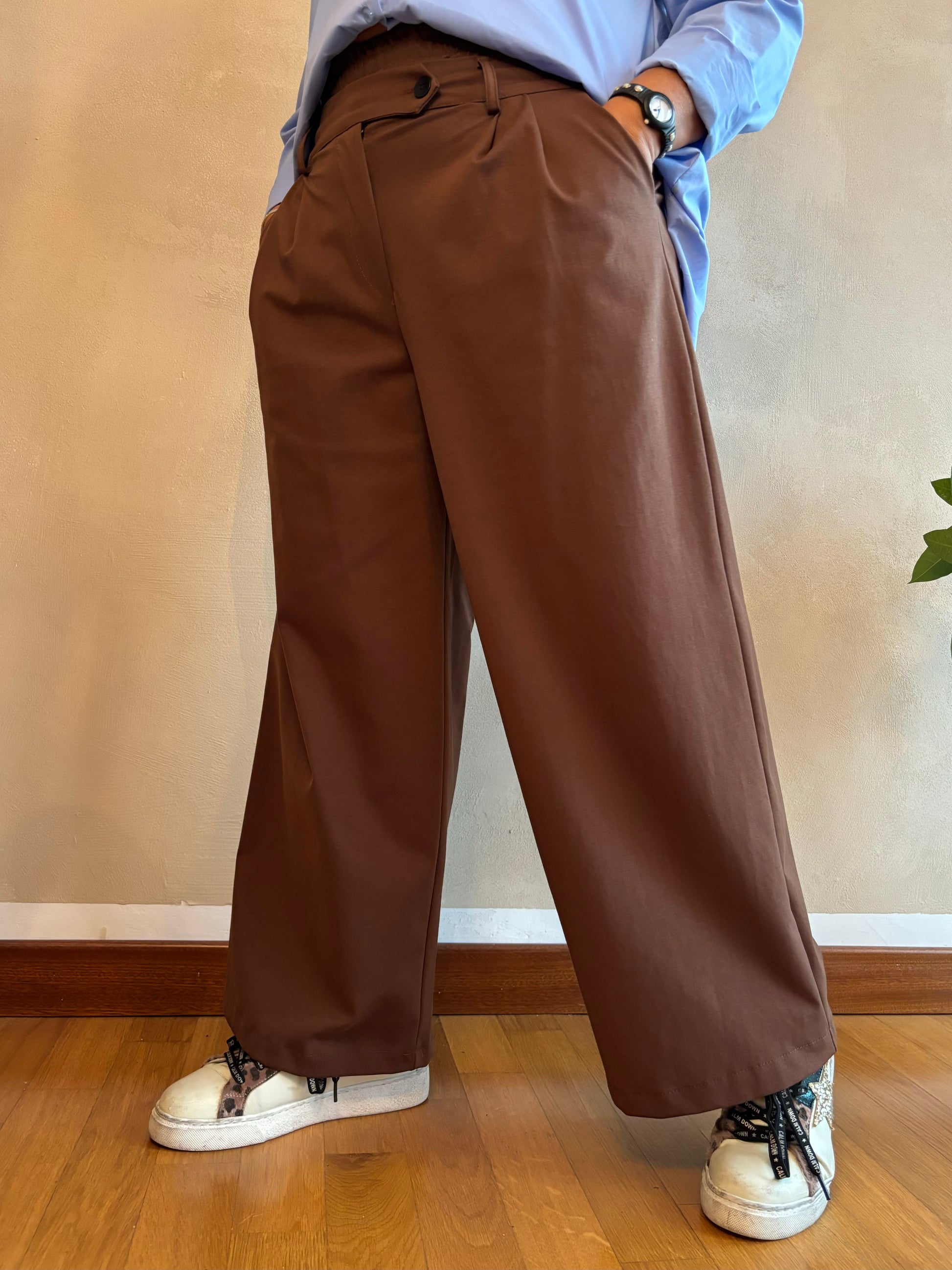 Pantalone a palazzo con banda alta elastica in vita e chiusura con unico bottone e zip. Taglia unica veste fino ad una 46. Composizione 53% cotone 38% poliammide 9% elastan