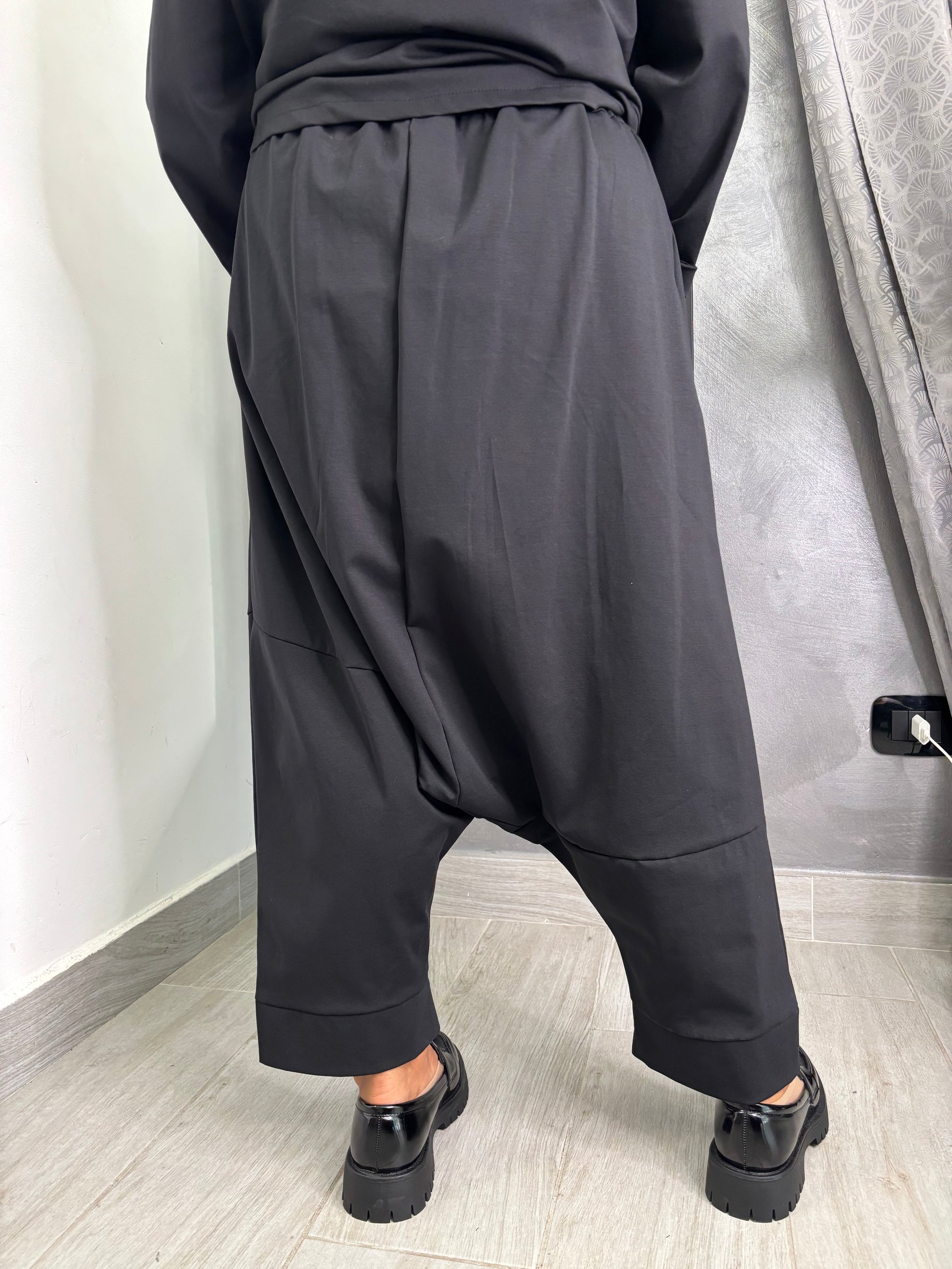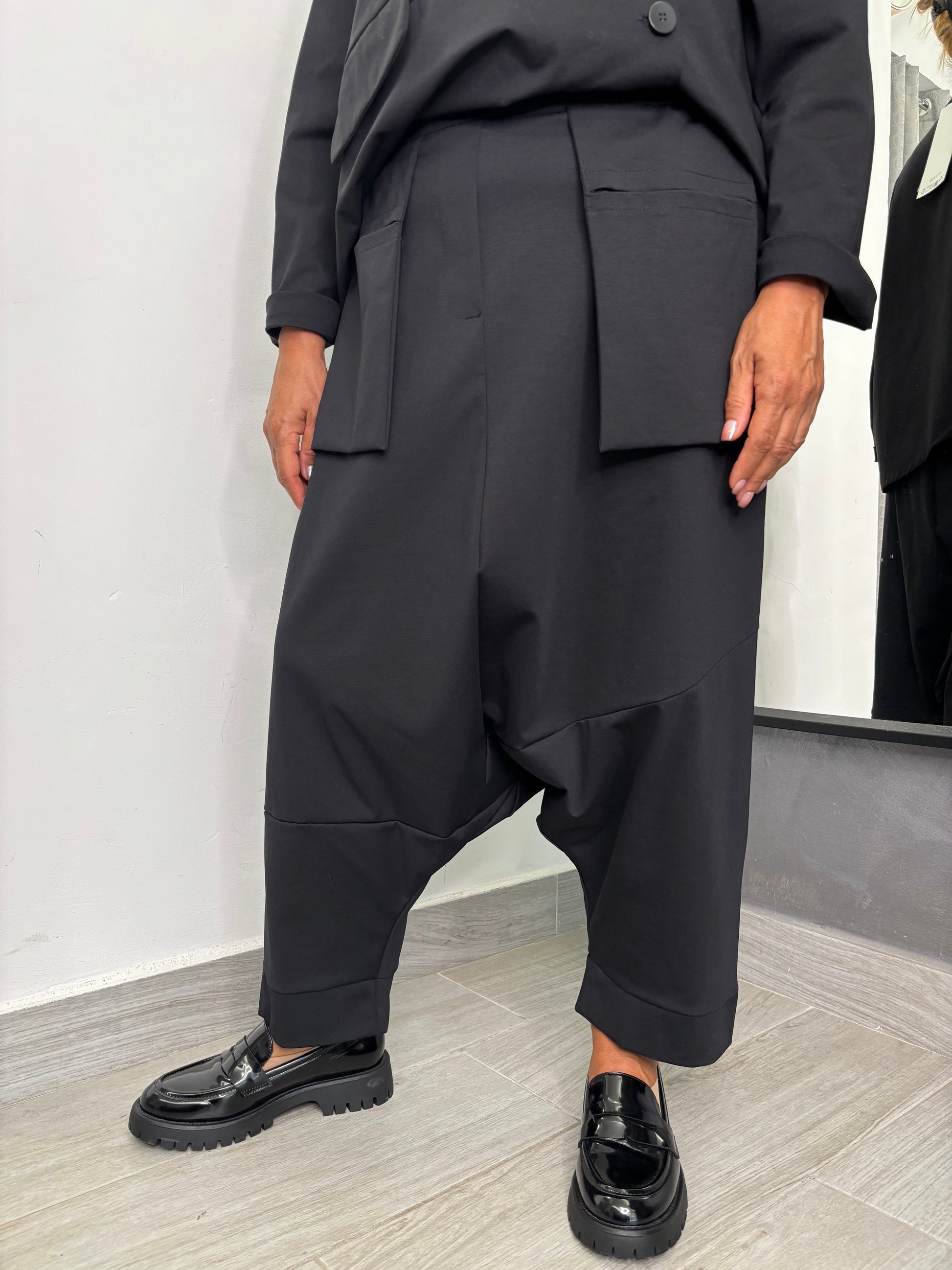 Pantalone in tessuto punto Milano modello a cavallo basso, elastico sulla circonferenza vita posteriore, tasche cucite in vita esterne. Taglia unica veste fino ad una 48. Composizione 53% cotone 38% poliammide 9% elastan.