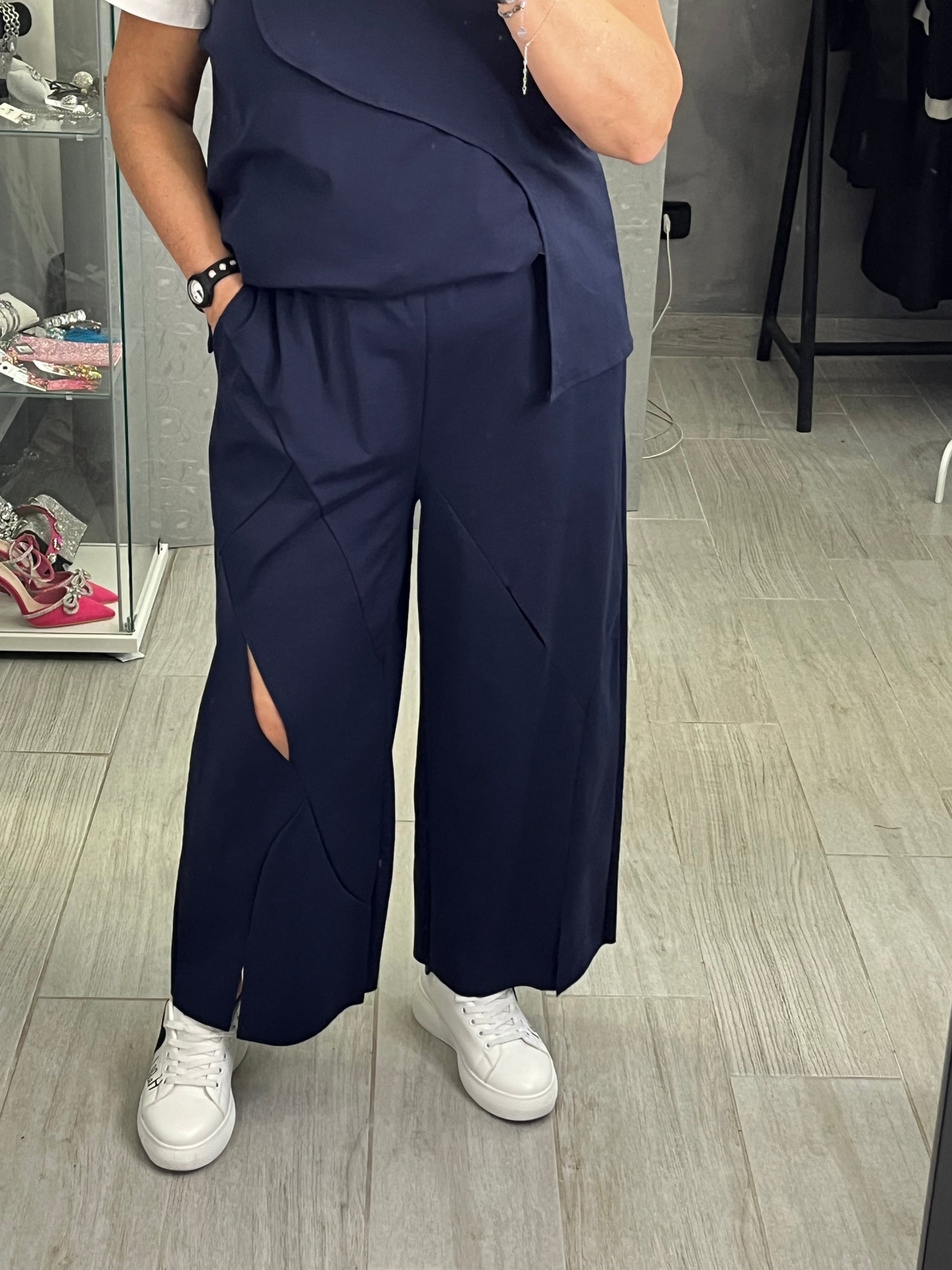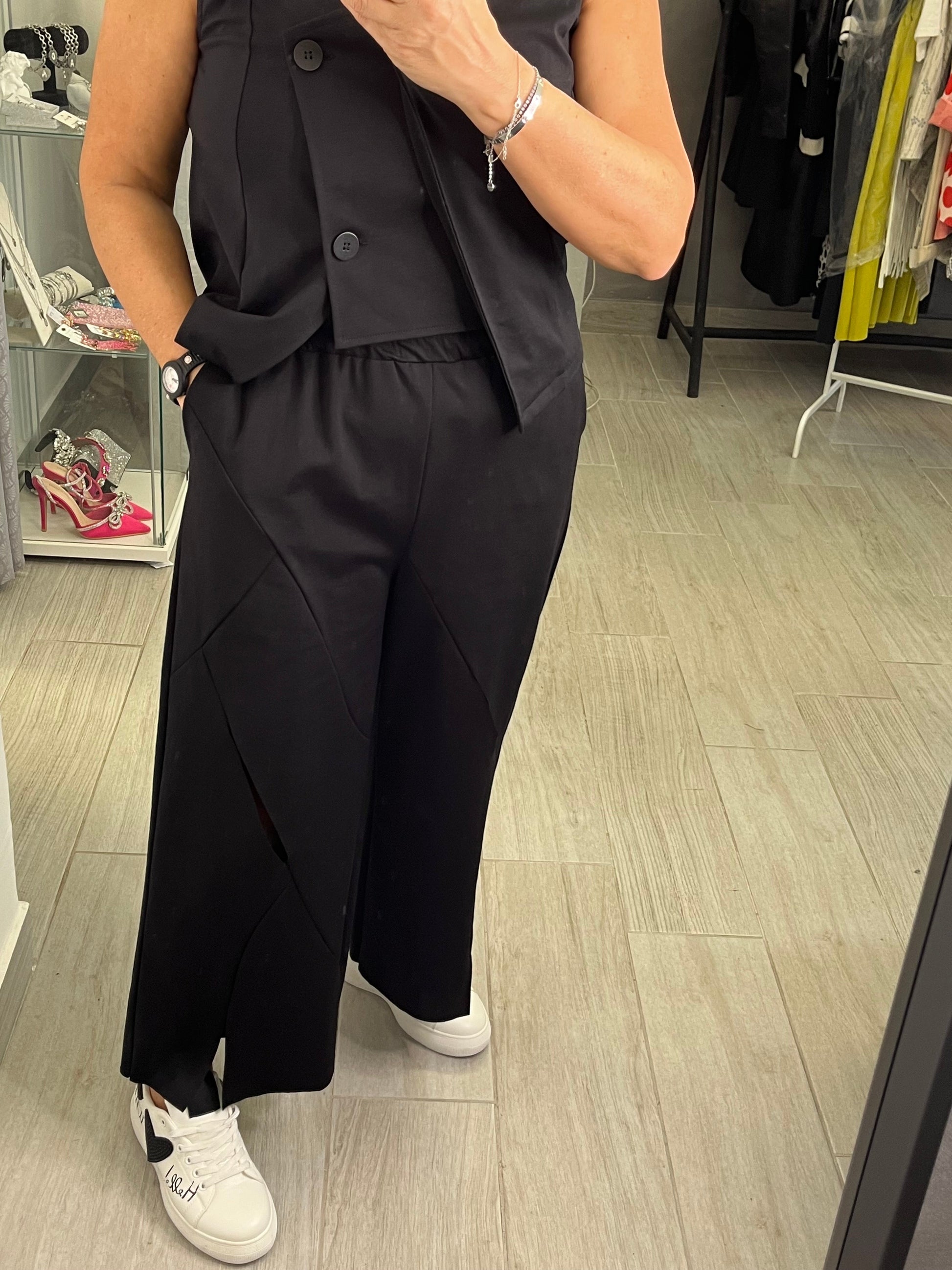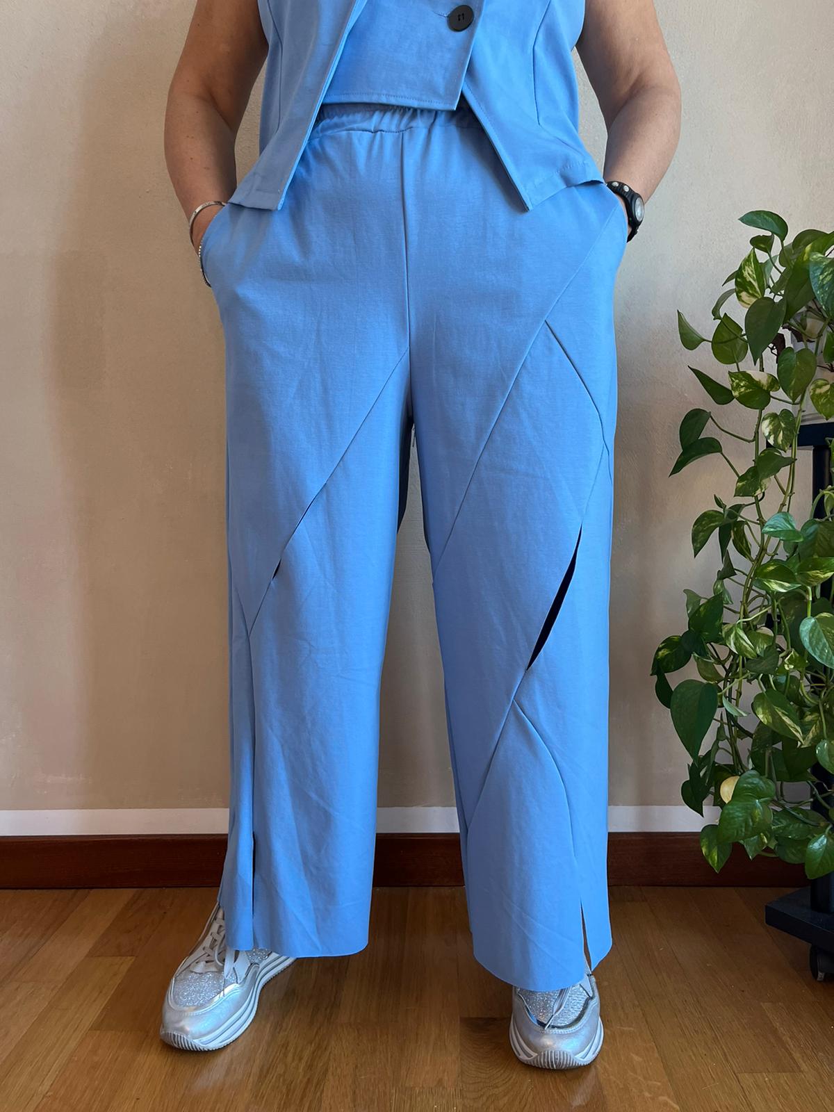Pantalone in punto Milano, con gamba larga, tagli e cuciture sulla parte davanti della gamba, elastico su tutta la circonferenza vita, tasche trasversali. Taglia unica veste fino ad una 48. Composizione 53% cotone 38% nylon 9% elastan