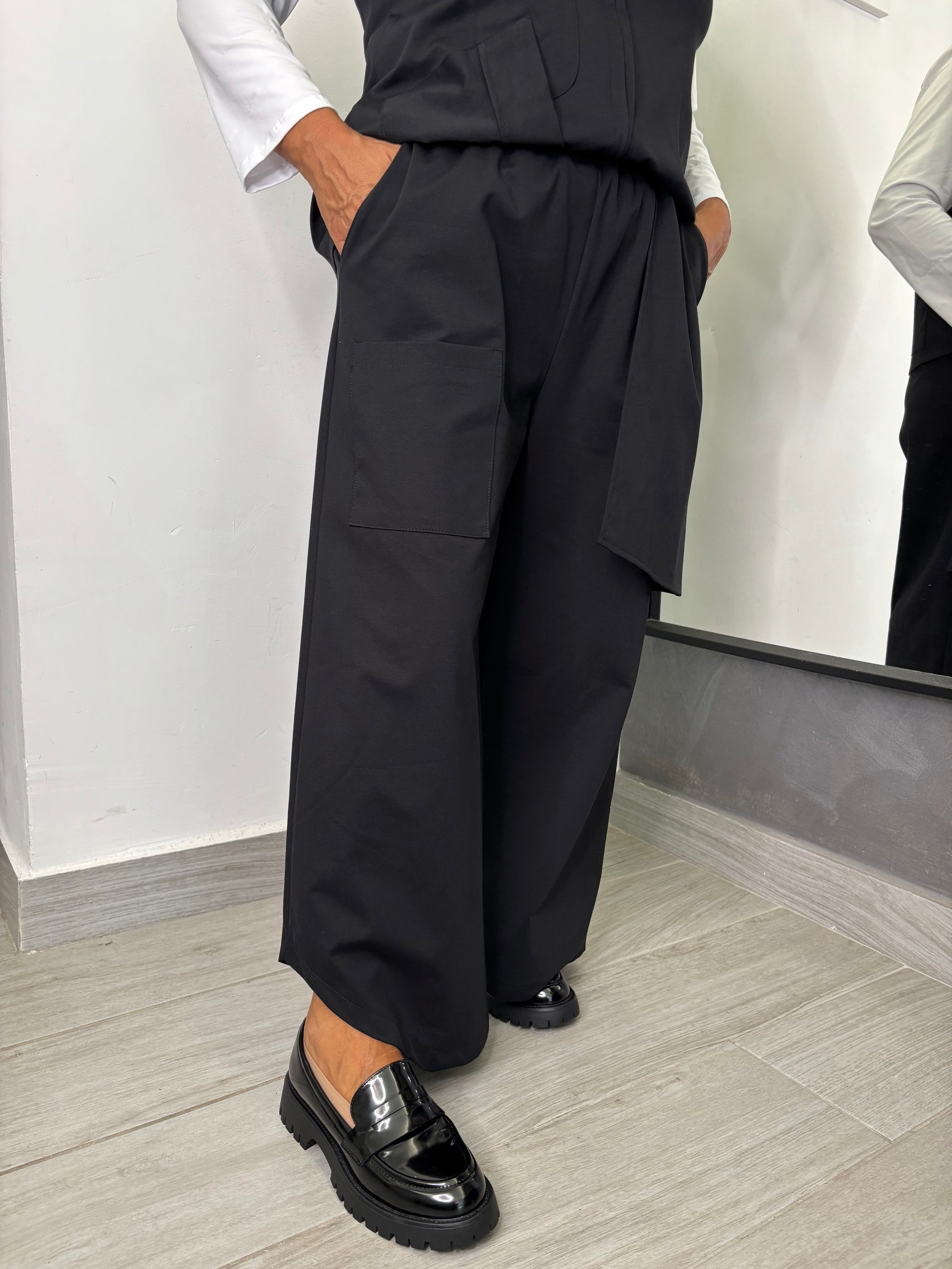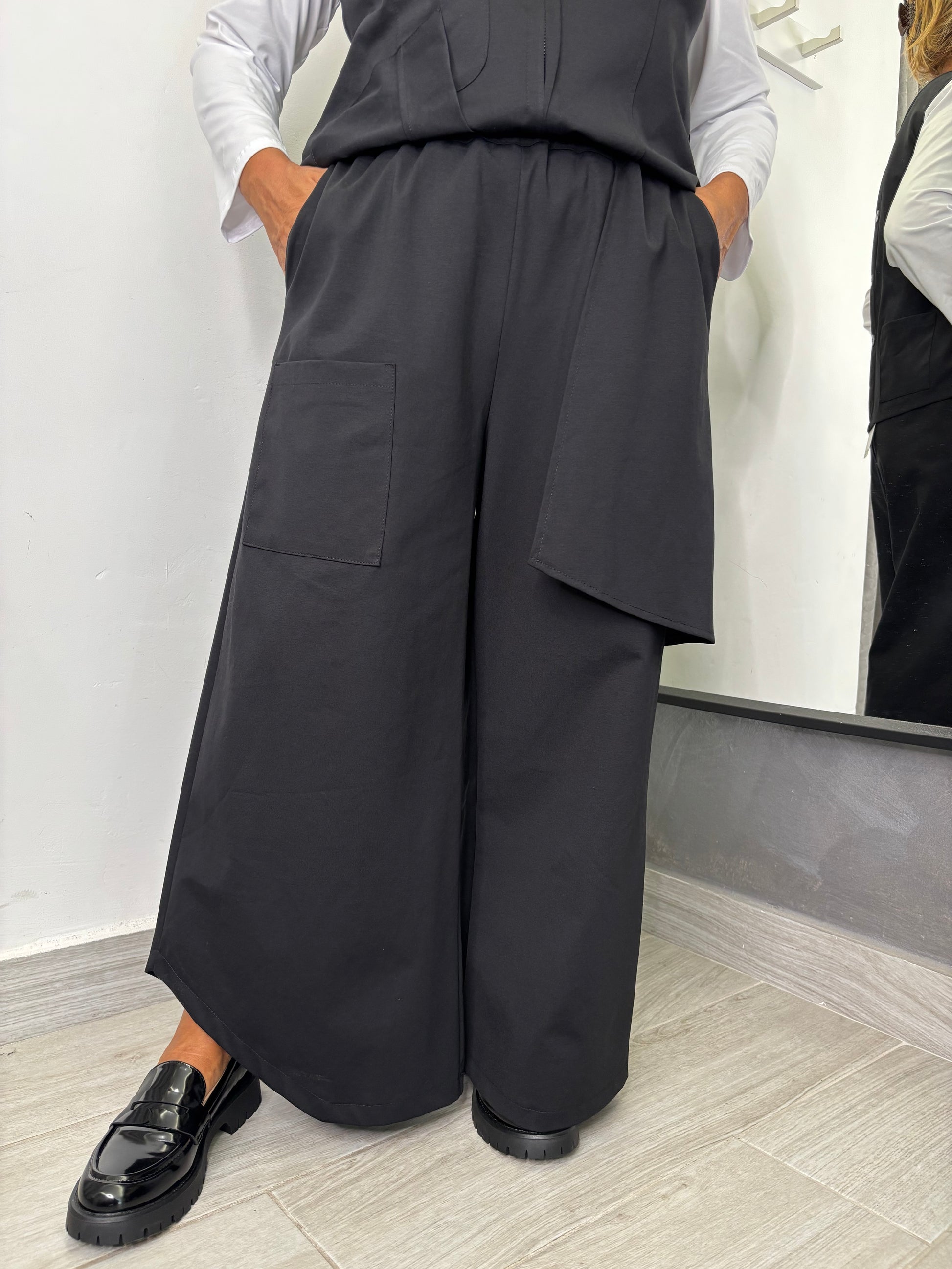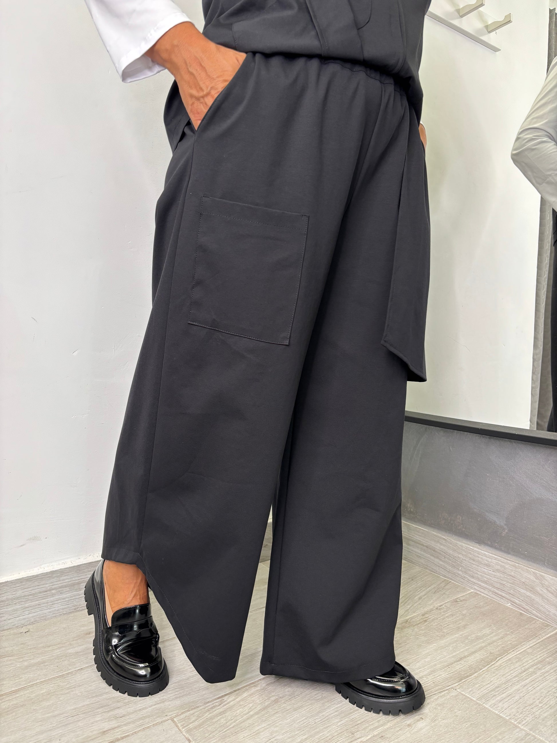 Pantalone in tessuto punto Milano, con tasche applicate sul davanti, gamba larga, quella di destra in fondo presenta una stondatura. Elastico su tutta la circonferenza della vita. Taglia unica veste fino ad una 48. Composizione 53% cotone 38% poliammide 9% elastan