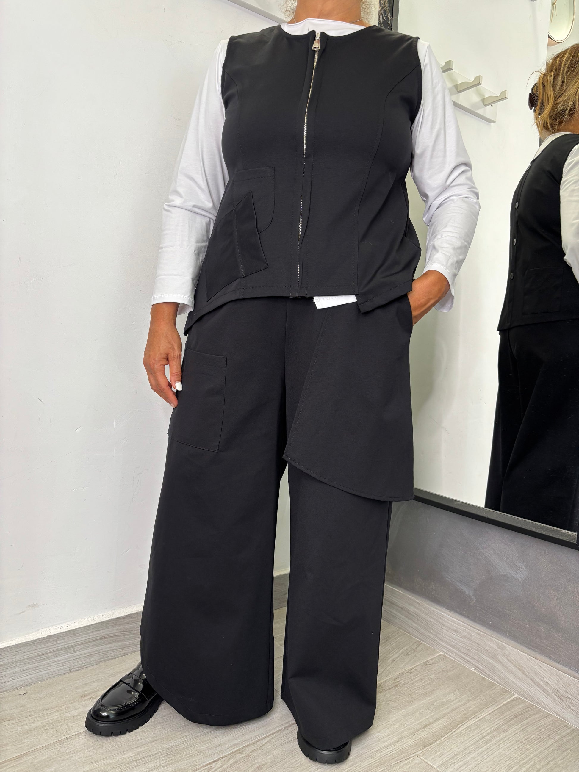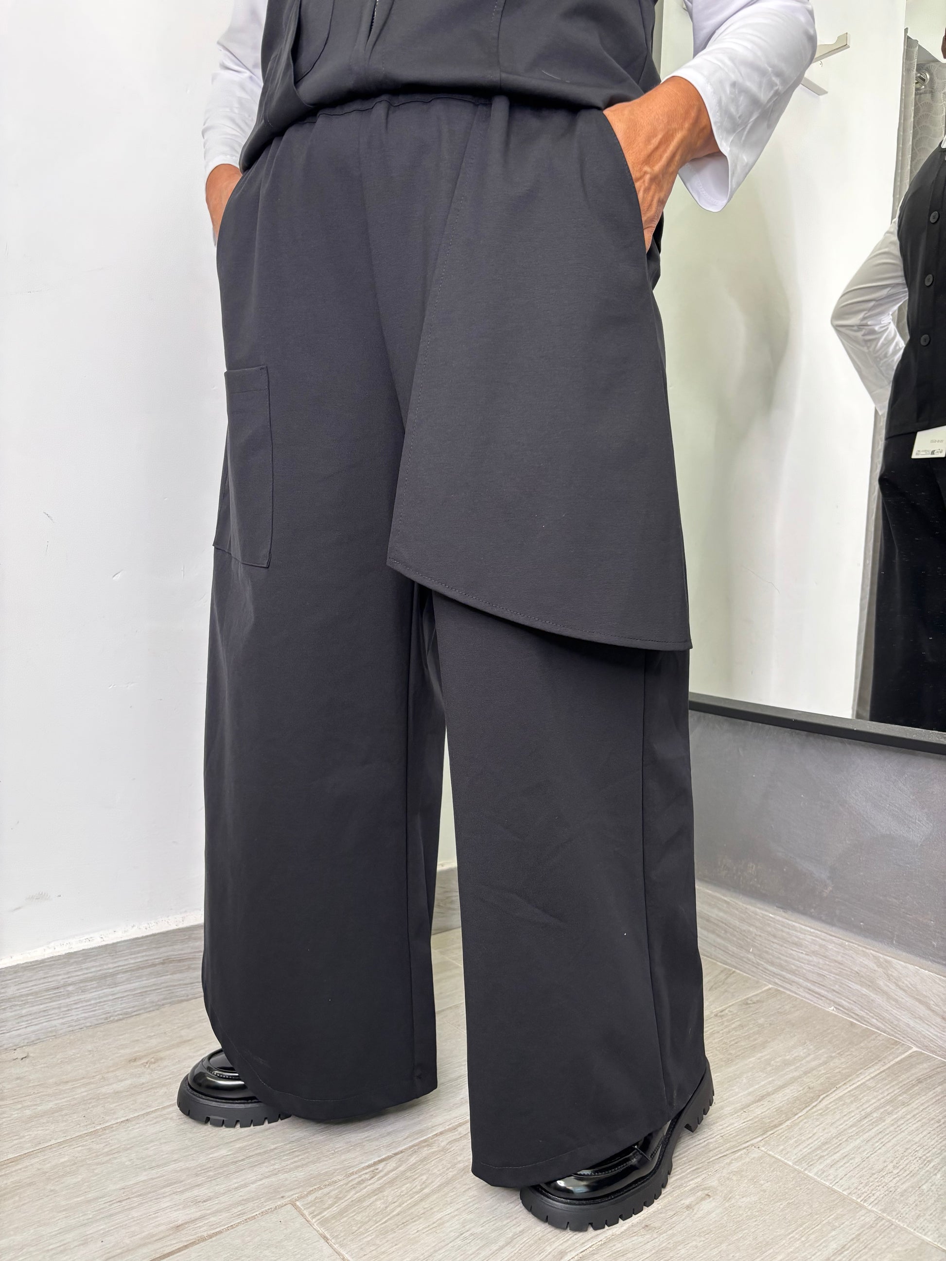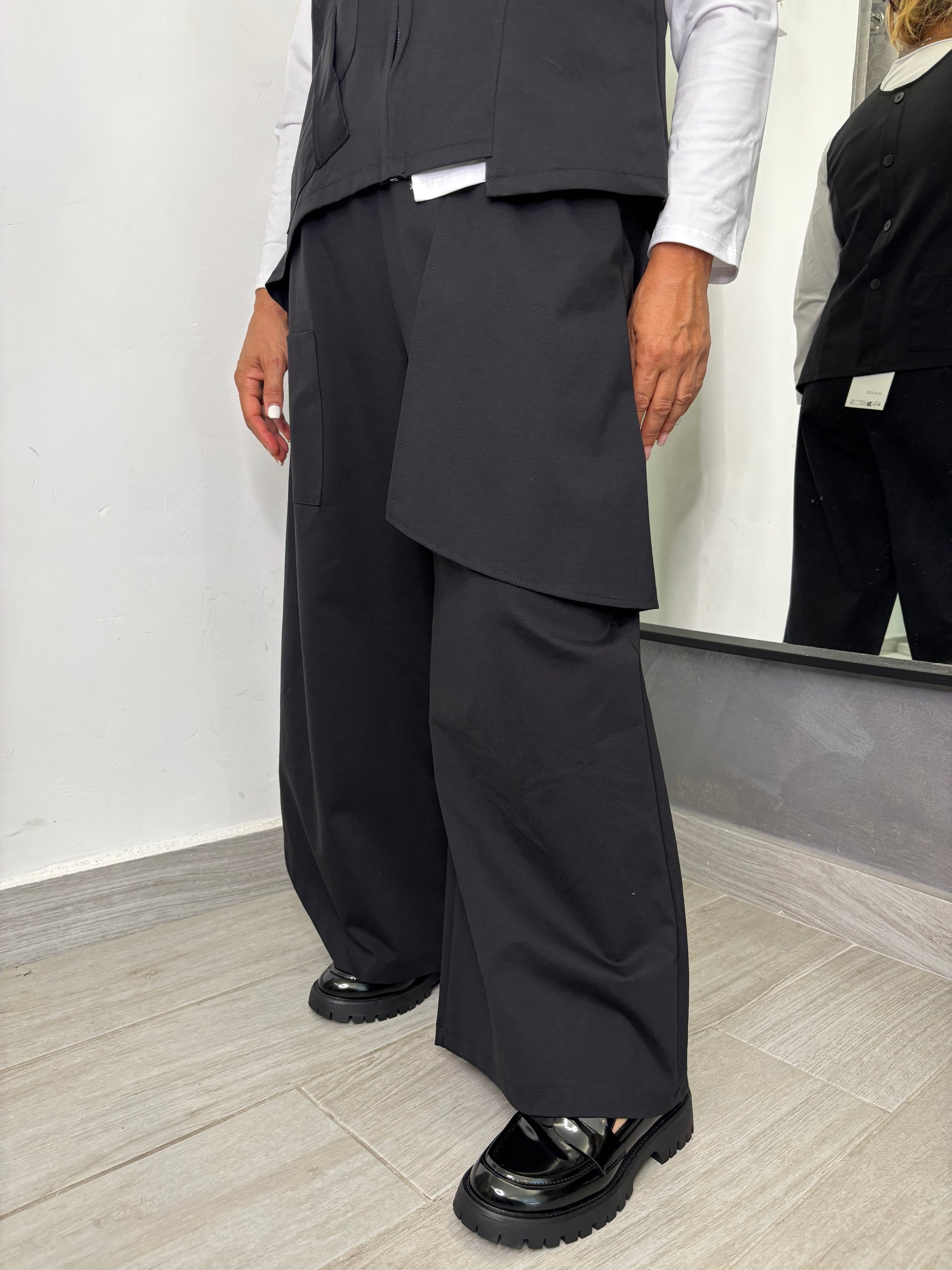 Pantalone in tessuto punto Milano, con tasche applicate sul davanti, gamba larga, quella di destra in fondo presenta una stondatura. Elastico su tutta la circonferenza della vita. Taglia unica veste fino ad una 48. Composizione 53% cotone 38% poliammide 9% elastan