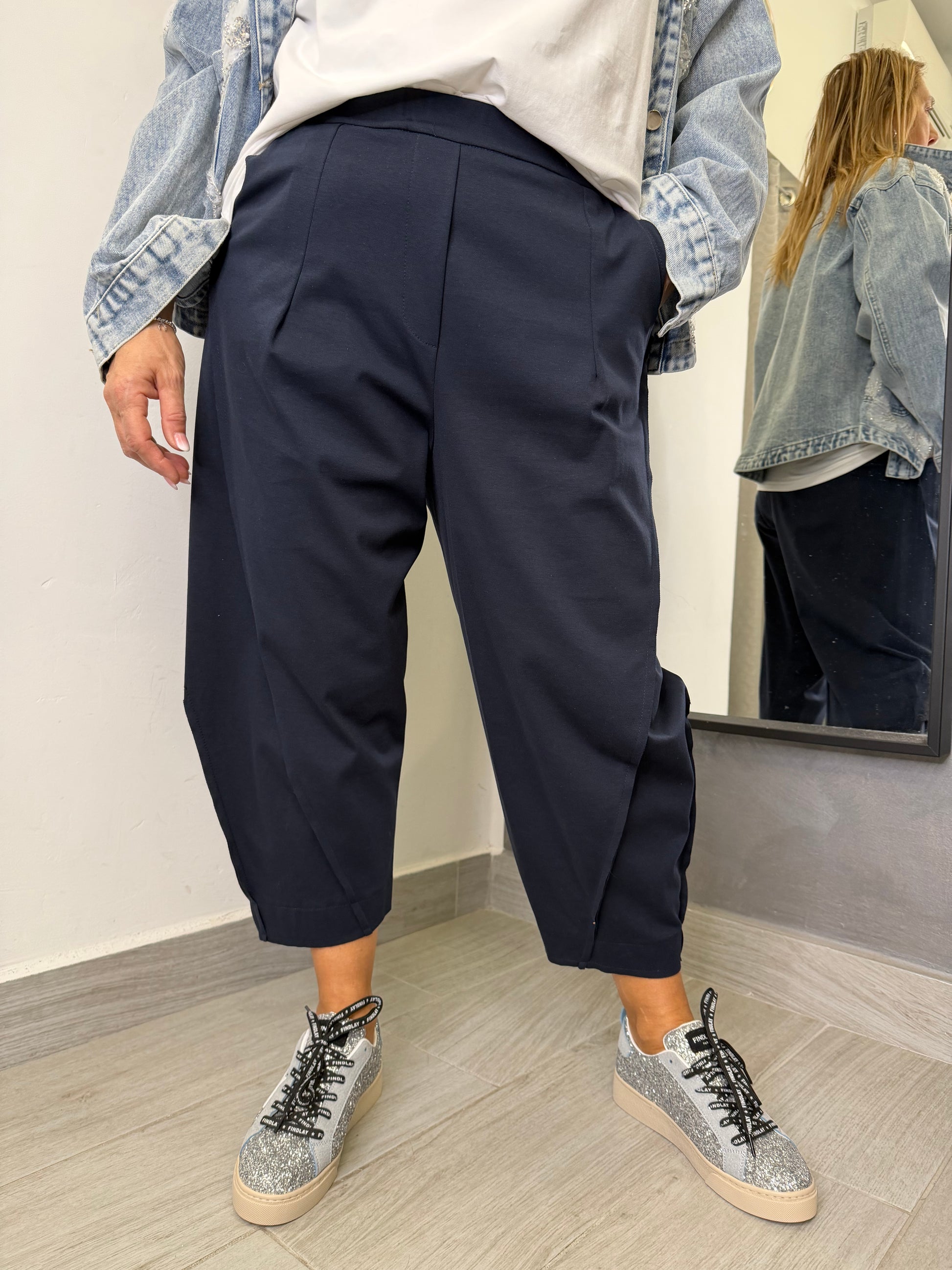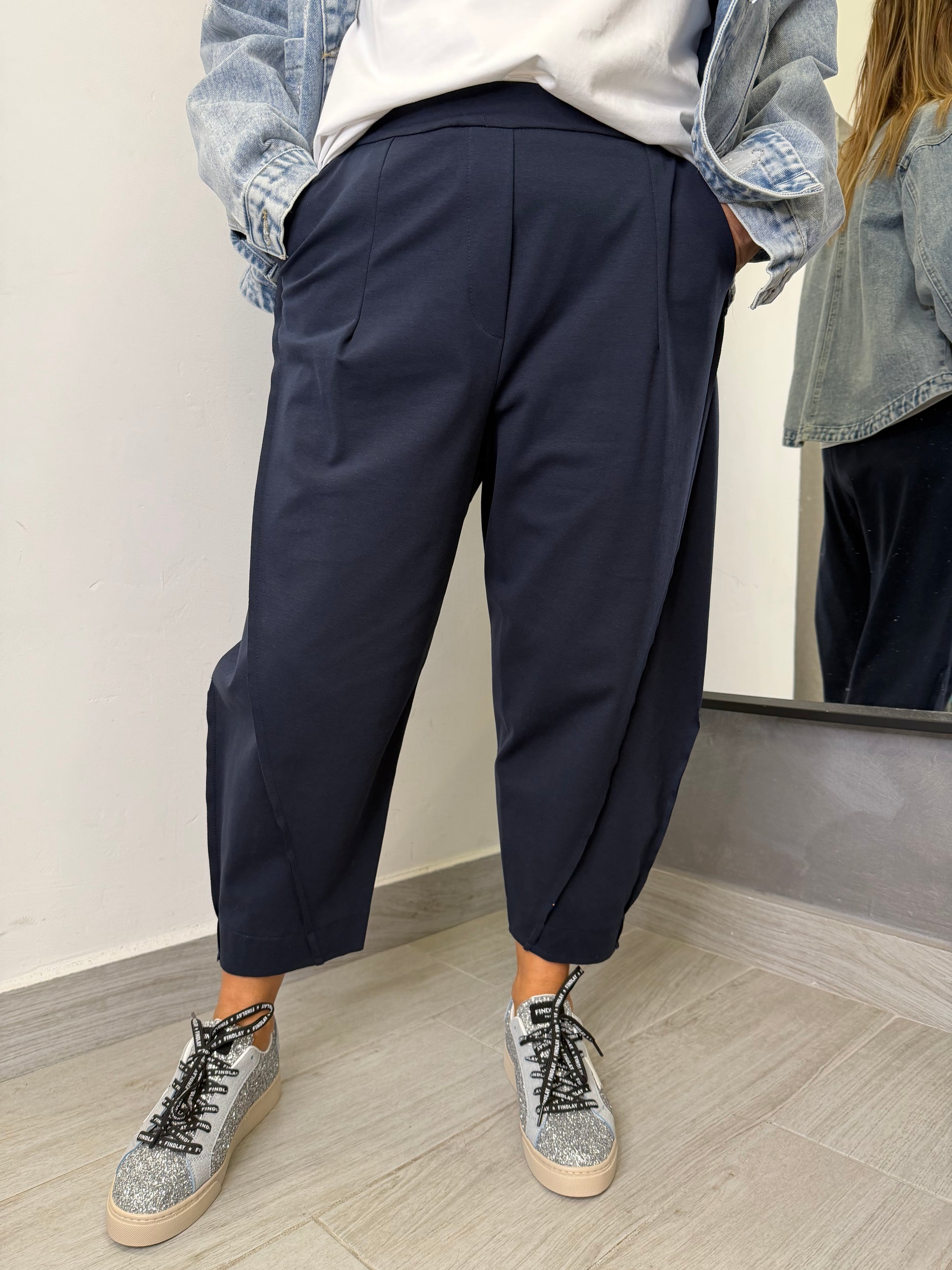 Pantalone in punto Milano, elastico in vita. Motivo cuciture a taglio vivo lungo tutta la gamba, tasche laterali davanti e finte dietro. Taglia unica. Vestibilità larga e comoda. Veste fino ad una 48. Composizione 53% cotone 38% poliestere 9% elastan