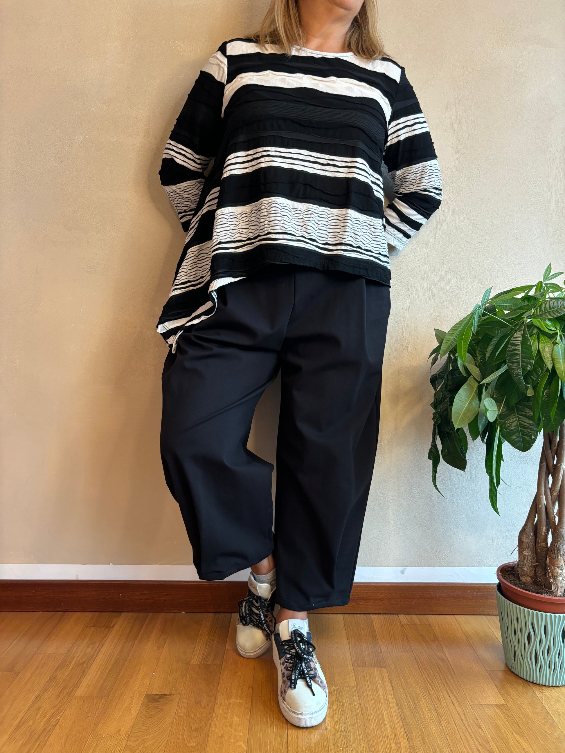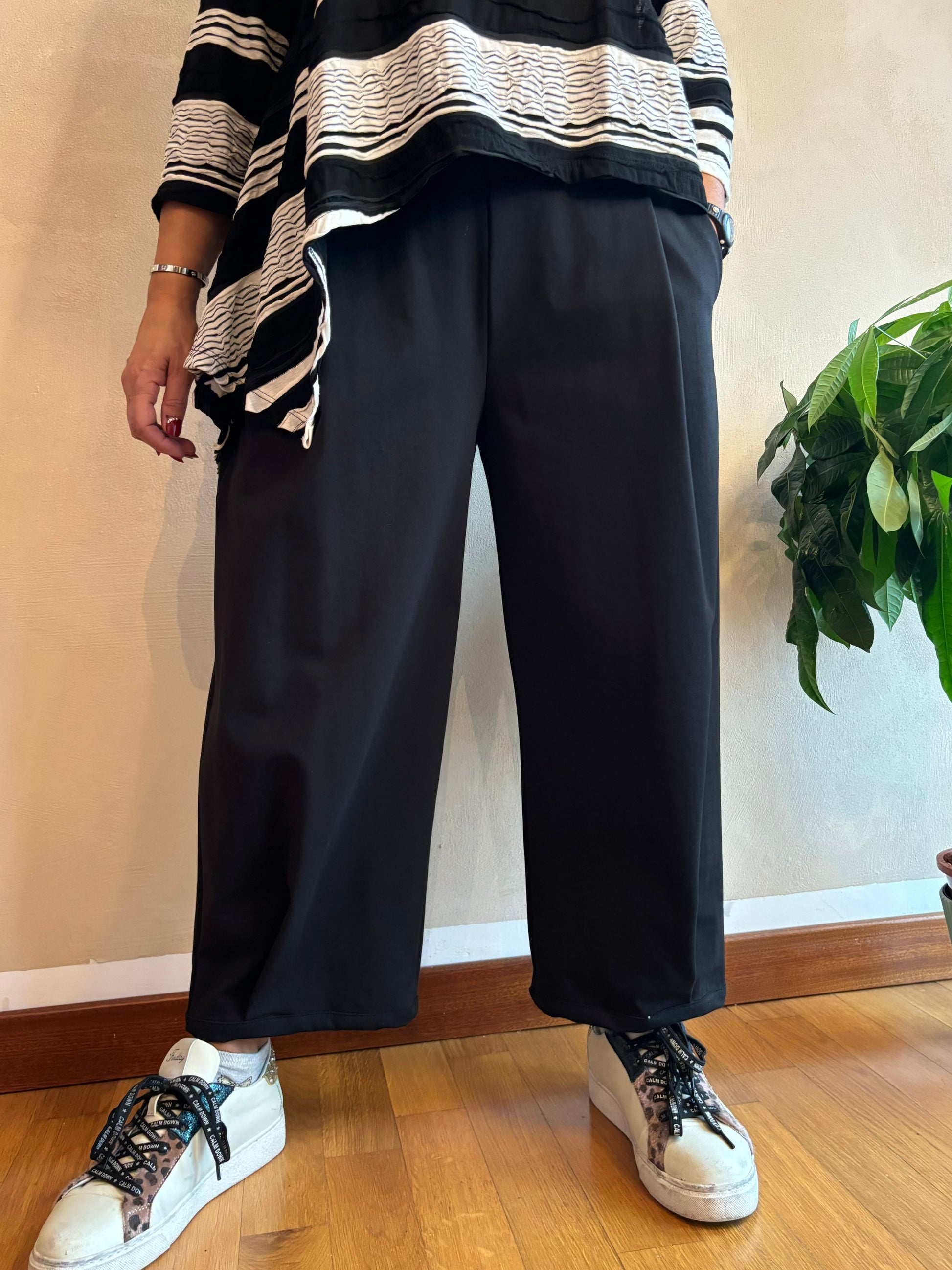Pantalone gamba larga con pencies cucite in vita e in fondo sulla caviglia. Elastico su tutta la circonferenza. Taglia unica veste fino ad una 48. Composizione 52% cotone 40% poliammide 8% elastan.