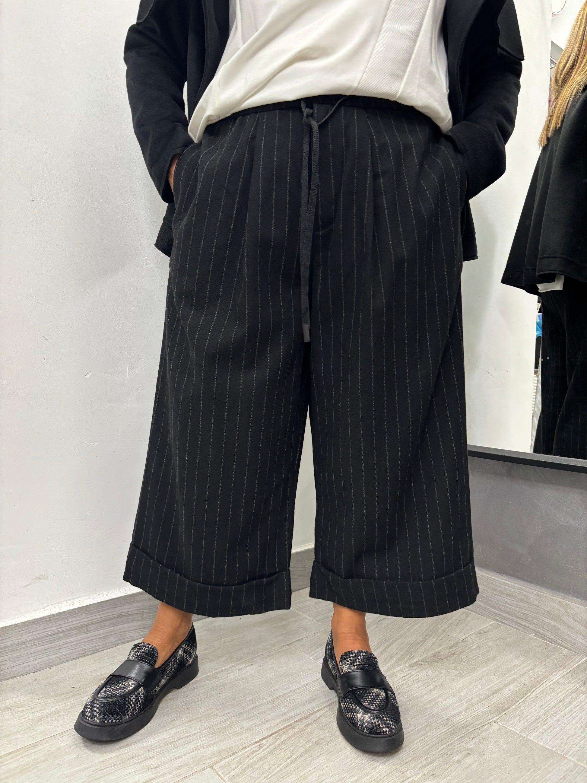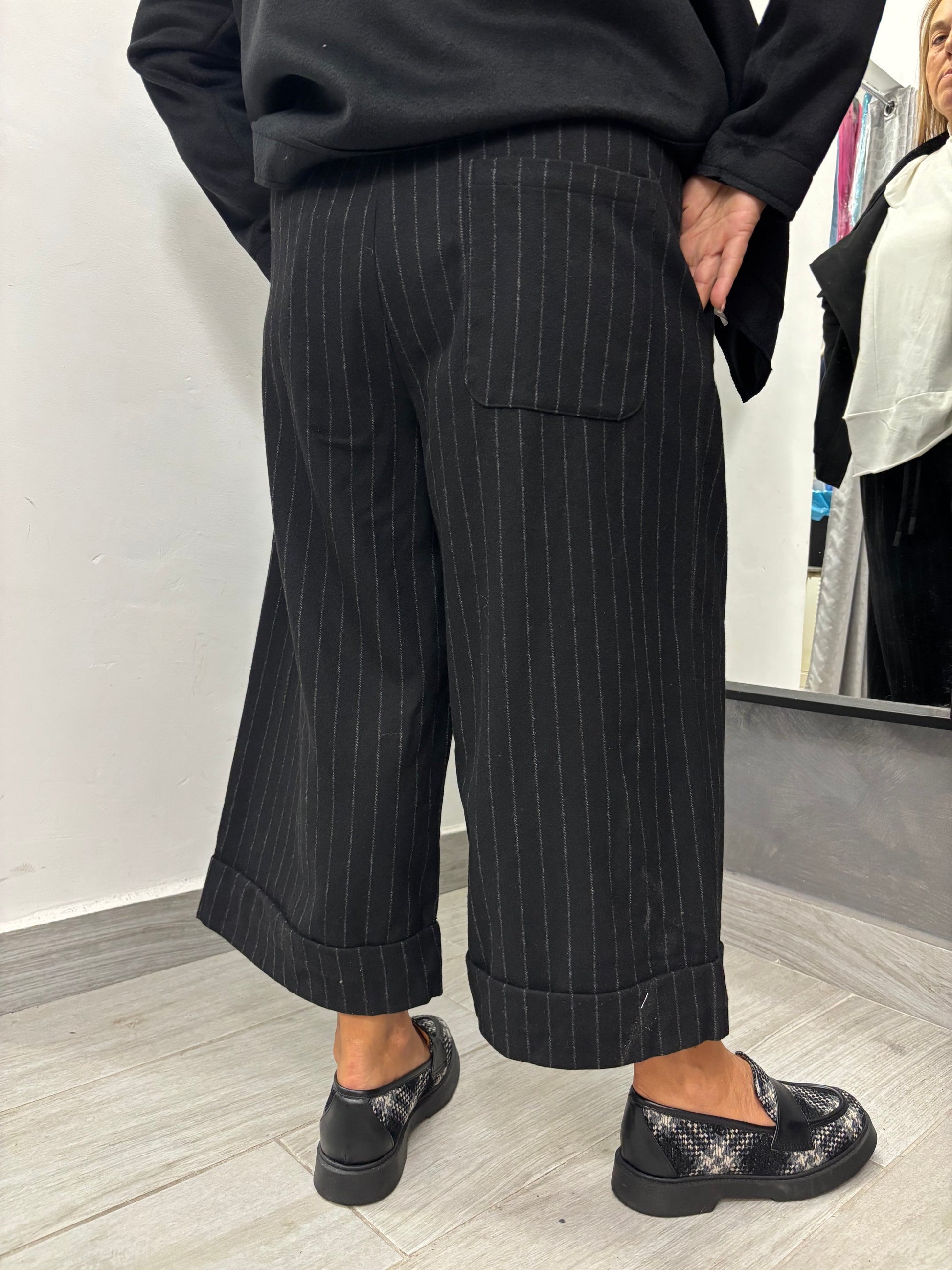 Pantalone modello gamba larga in tessuto gessato, con zip e bottone. Tasche inserite nei fianchi e una dietro applicata. Taglia unica veste fino ad una 46. Composizione 71% poliestere 16% lana 12% lana vergine 1% elastan.