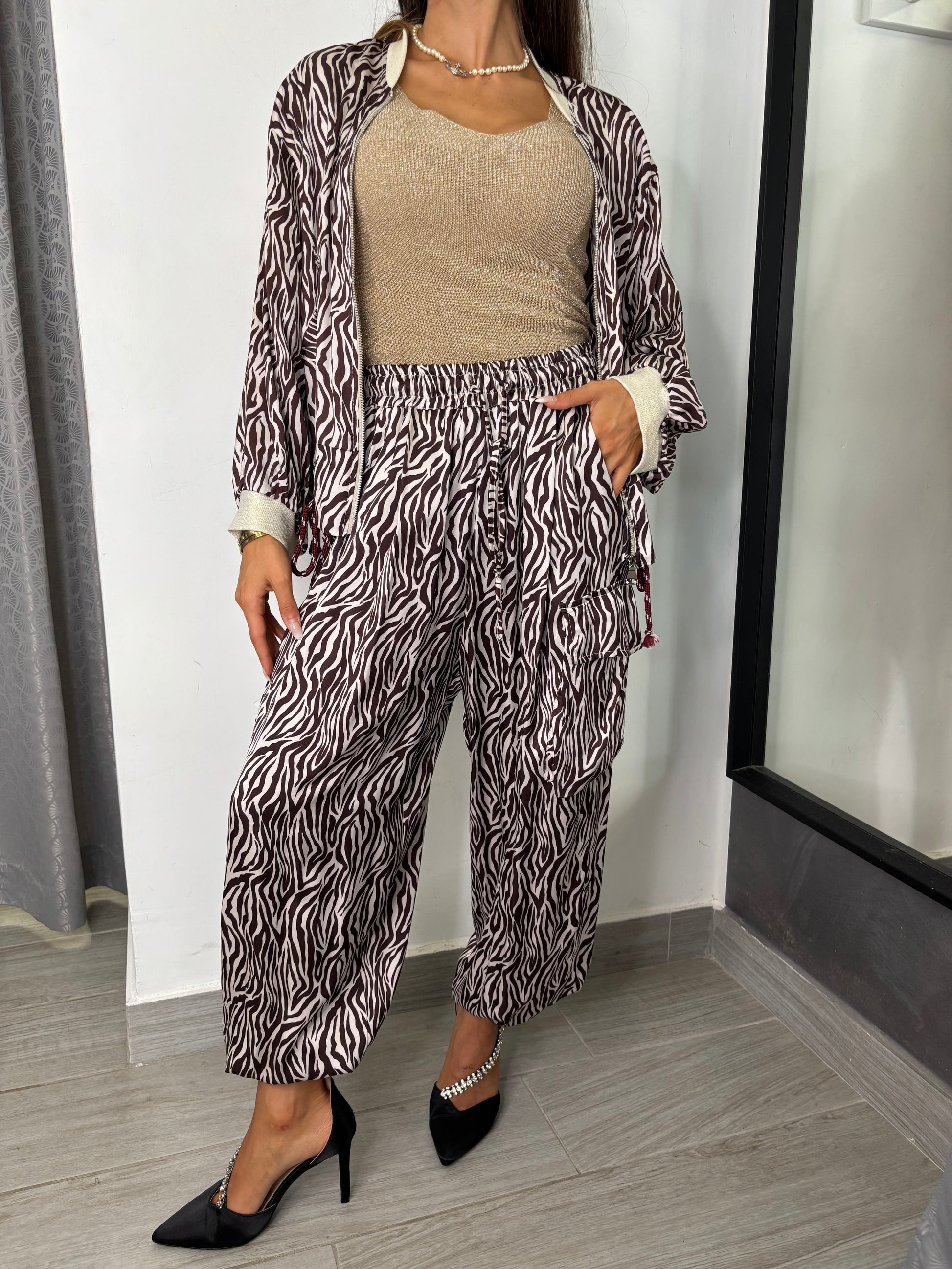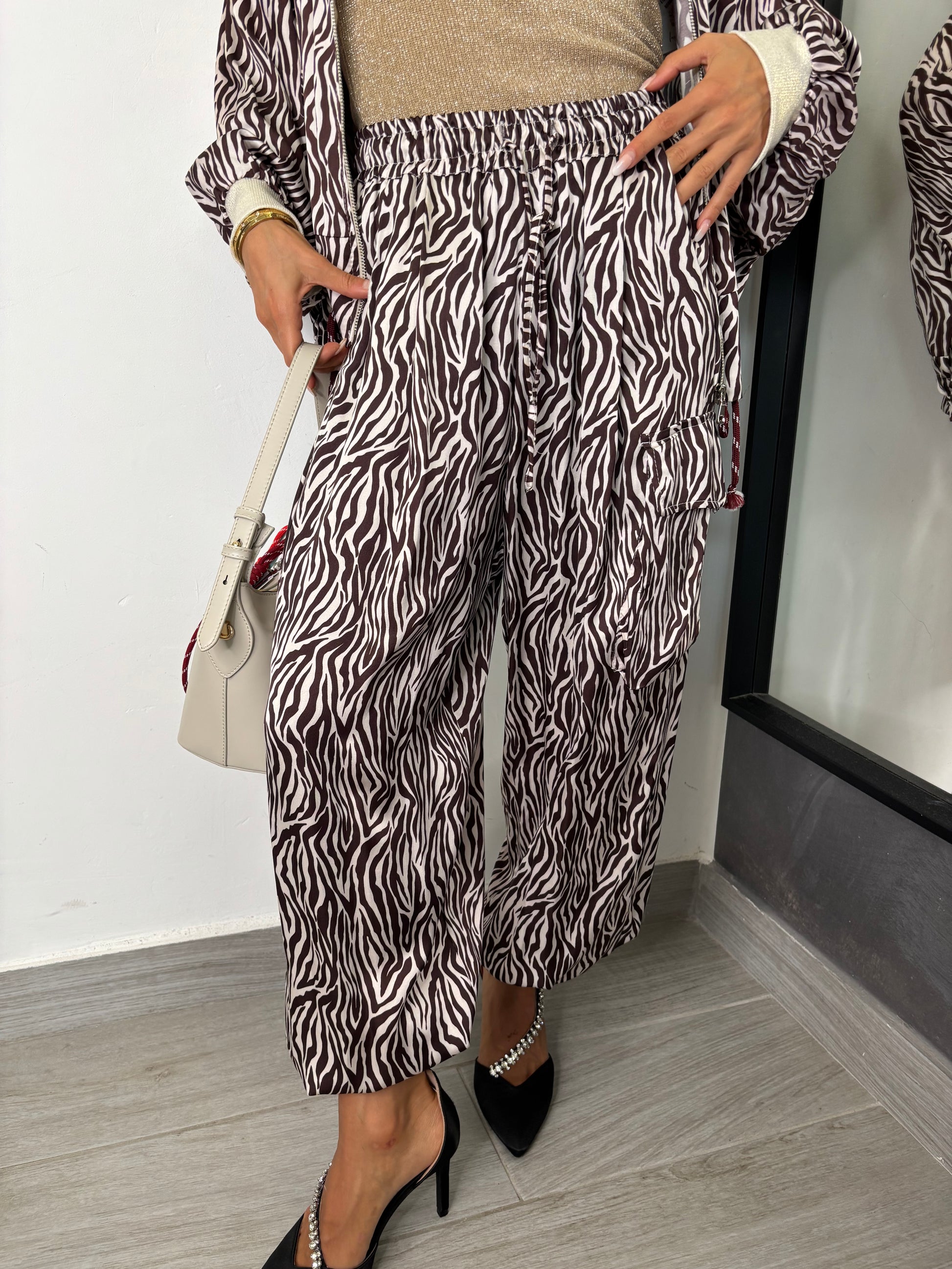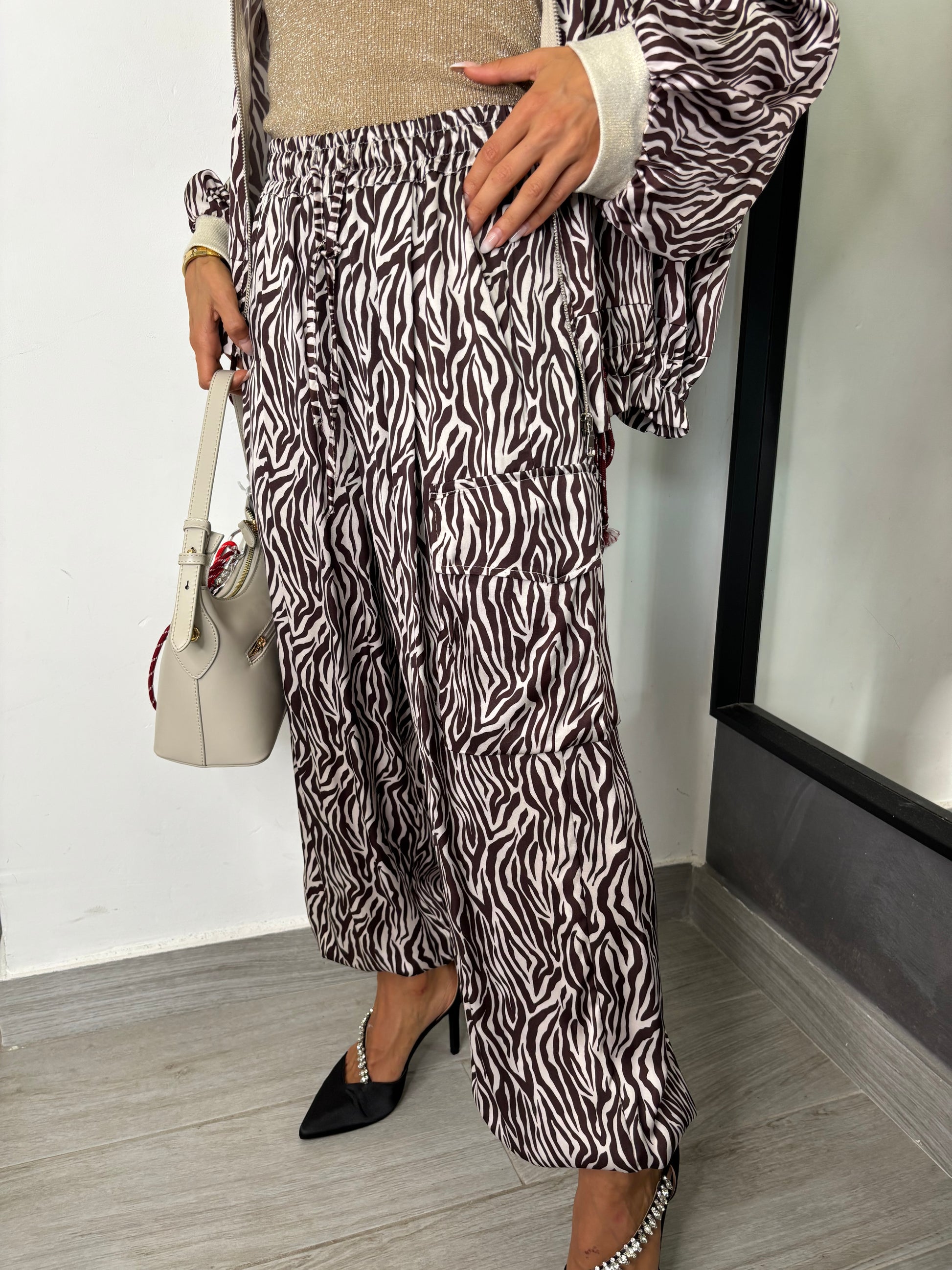 Pantalone modello cargo in pura viscosa con elastico in vita e coulisse. Dettaglio elastico sul fondo della caviglia. Taglia unica veste fino ad una 44