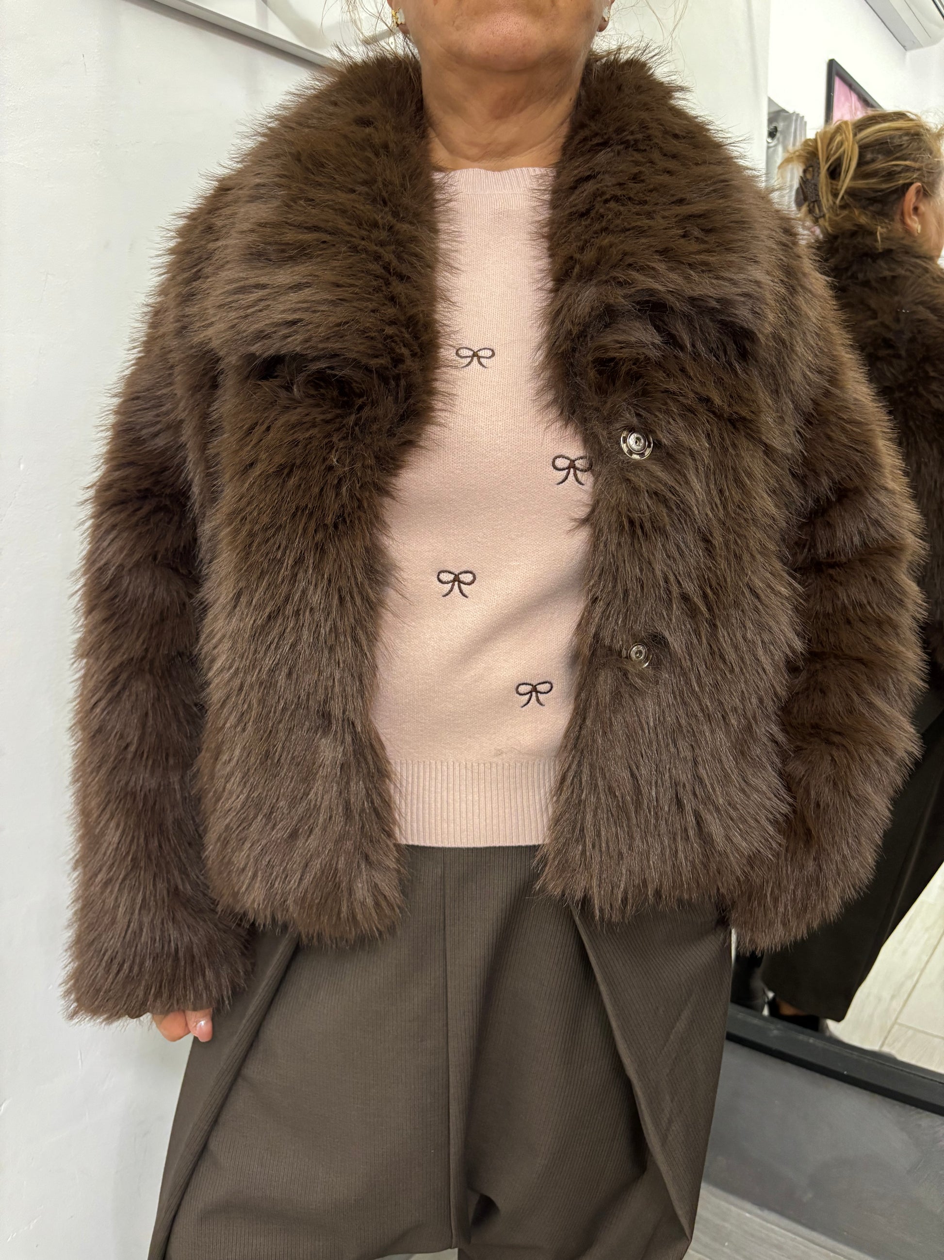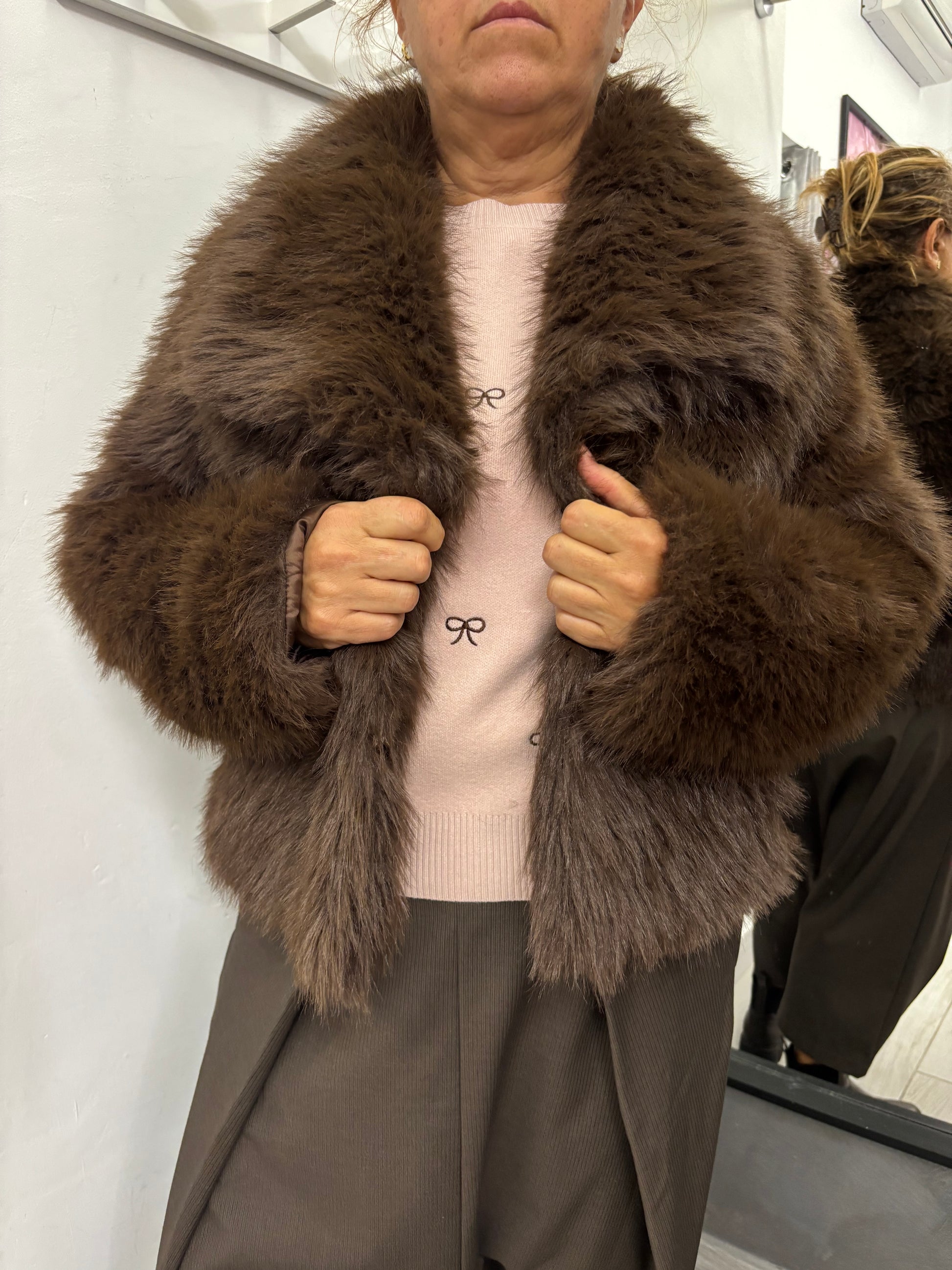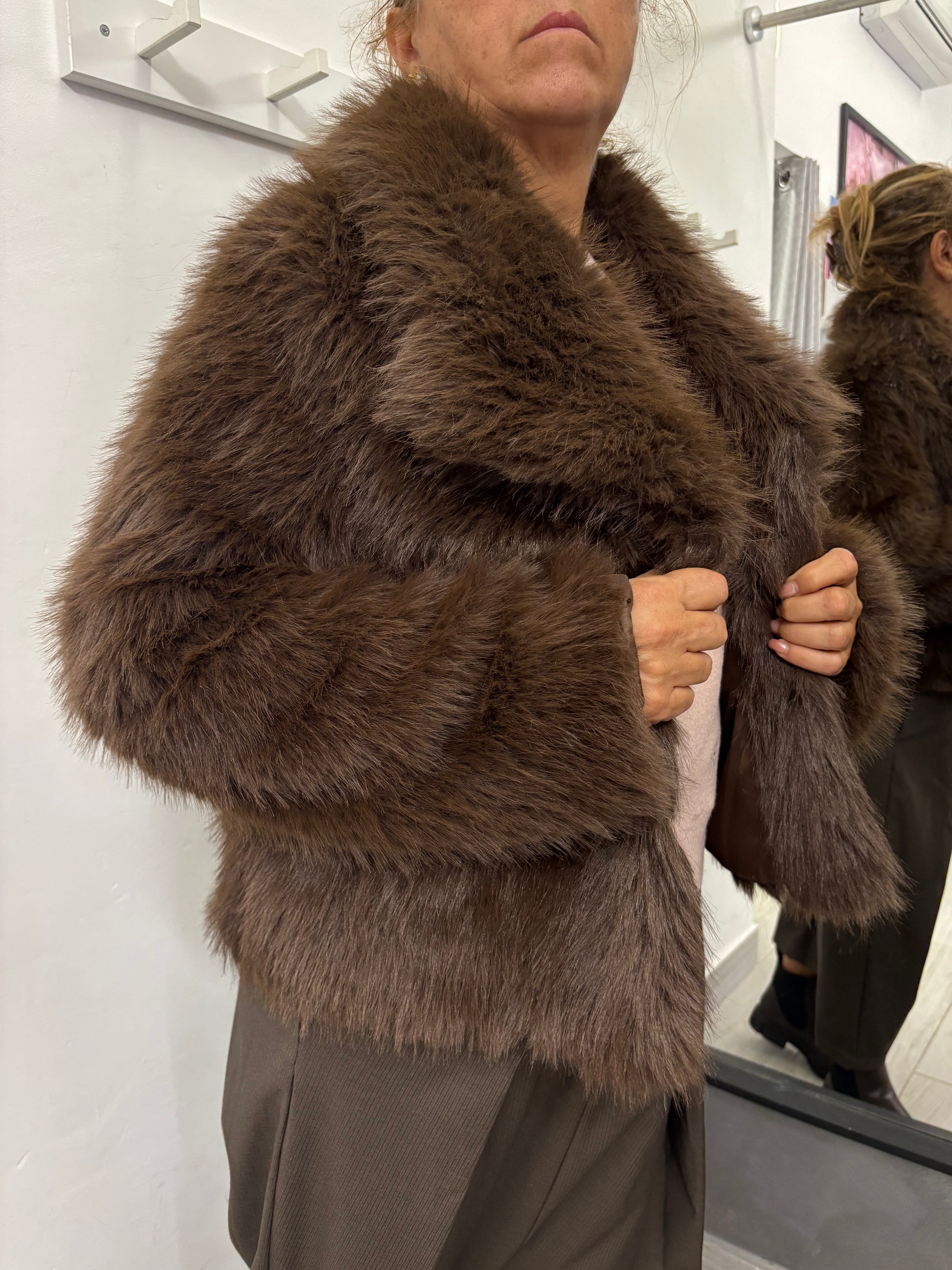 Pelliccia ecologica modello corto, collo a scialle, chiusura con due automatici.